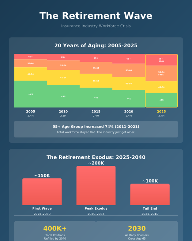Over the next 15 years, 50% of the insurance workforce will retire. That's more than 400,000 positions that will go unfilled, according to the US Chamber of Commerce. Four hundred thousand jobs where decades of expertise simply walks out the door.